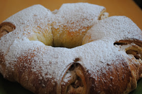 This month's challenge is brought to us by Jamie @ Life's a Feast and Ria of Ria's Collection. This is a yeast risen dough, with a meringue filling with whatever tickles your fancy, rolled up like a cinnamon rolled, formed into a wreath and baked. Jamie found this recipe on a piece of yellowed paper in her dad's collection of clipped and hand-written recipes from the 70's. No date, no source, and she tried the recipe and it was a hit.
